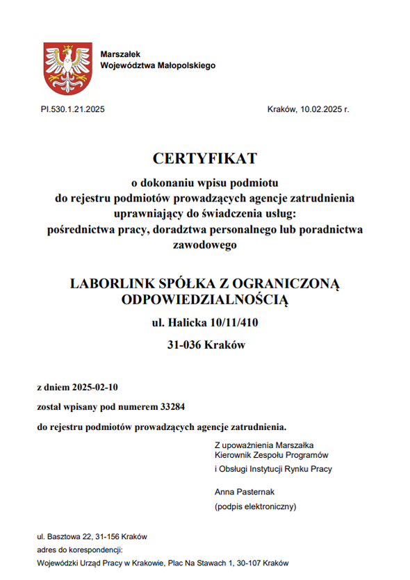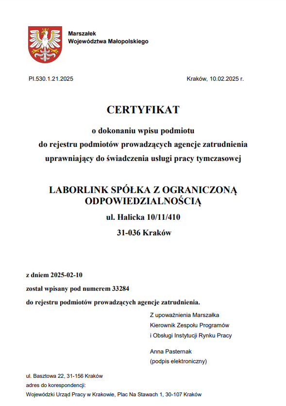 Działamy zgodnie z przepisami prawa, co daje pewność, że Twoja umowa i warunki zatrudnienia są zgodne z obowiązującymi standardami.